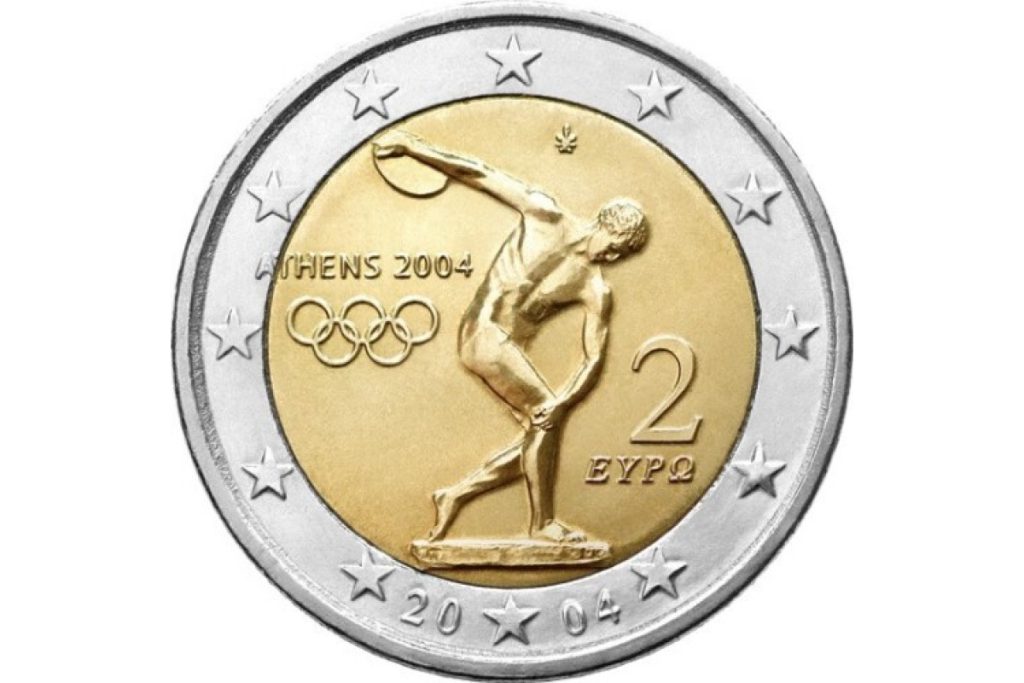 En van deze zes was Griekenland het land dat de eerste herdenkingsmunt van 2 euro in de geschiedenis sloeg. Voor deze gelegenheid, en ter gelegenheid van de Olympische Spelen die dat jaar van 13 tot 29 augustus in Athene werden gehouden, koos Griekenland voor een sportief motief voor deze eerste munt.